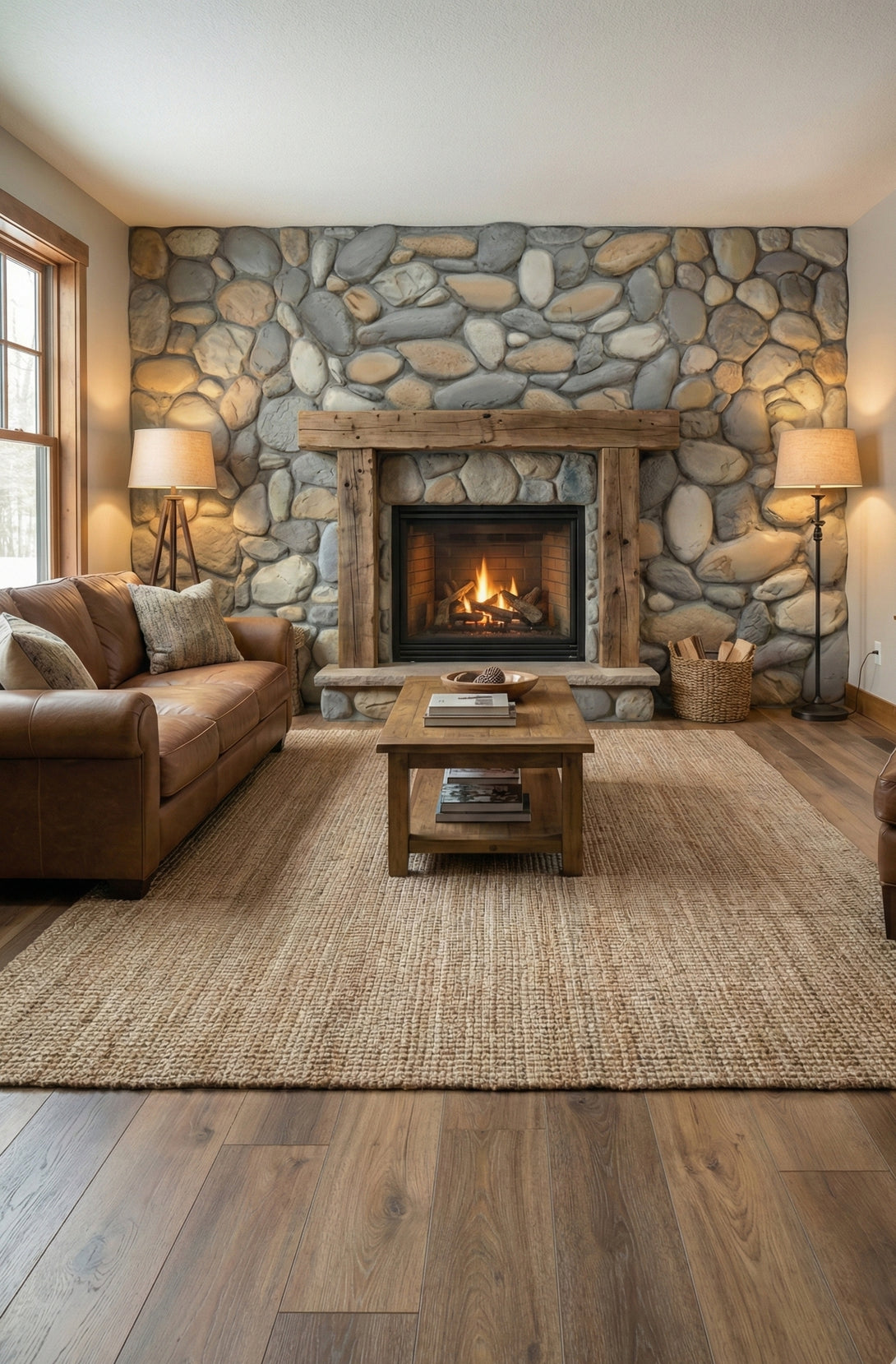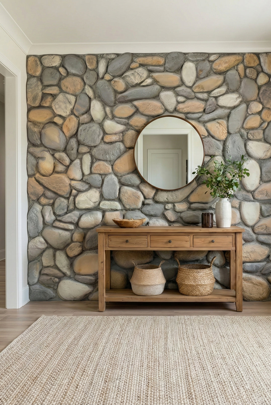 Each panel mimics irregular shapes and earthy tones to create a handcrafted, authentic effect without the heavy weight or grout labor of real stones.