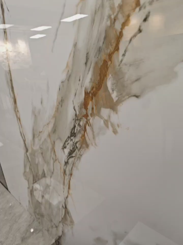 Description: Bring the opulence of Italian luxury into your home with this glossy wall panel. This stunning large-format sheet features a pristine white background interrupted by dramatic, sweeping veins of warm amber, antique gold, and charcoal grey. It perfectly captures the organic beauty of high-end natural stone, making it an impeccable choice for sophisticated living room feature walls, grand entryways, and luxury bathroom designs.